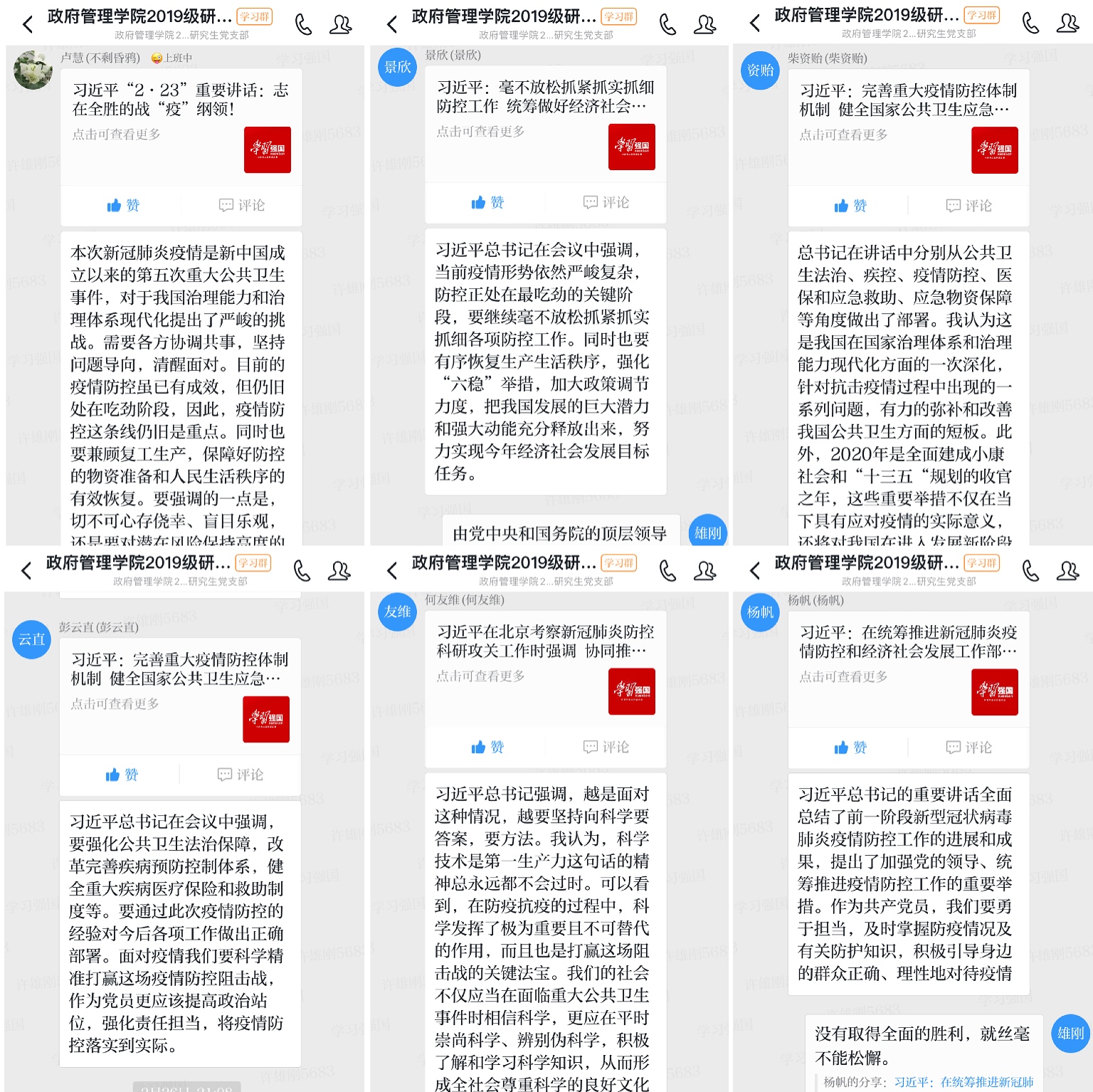 在创作聚力环节,党员同志们为抗击疫情写下了祝福语并拍摄了祝福视频,从党和国家的战略部署、社会主义制度的优越性发挥到一线抗疫工作人员的奉献精神,再到响应公司“停课不停学”的号召,党员们发表了自己的感悟和祝福,为武汉、湖北加油,为中国加油,凝聚了支部抗击疫情的精神力量,弘扬了社会正能量。本次创作聚力的素材将于近期通过微信公众号“CUFE政研一九支部”宣传推送。