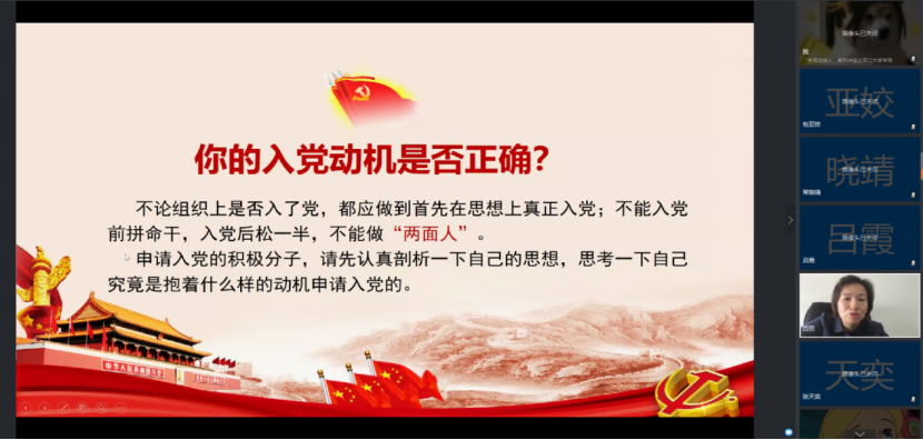 首先,针对入党“初心”,吕丽书记从入党动机切入,表明了正确的入党动机对个人以及党组织日后发展的重要性,并要求同学们认真审视自我,端正入党动机。紧接着,吕丽书记就老员工入党动机不正确的主要表现列举多个案例启发同学们,应摒弃私心杂念,减少功利心,真正发自内心地自愿入党。吕丽书记强调,正确的入党动机指为实现共产主义、全心全意为人民服务而要求入党。吕丽书记结合现实,通过讲述黄文秀等优秀共产党员的事迹,教导同学们积极承担责任,敢于牺牲,勇于奉献。吕丽书记指出端正入党动机是值得为之奋斗一生的事业,并回忆自身经历,表明入党动机的端正要通过加强理论修养、进行实践锻炼、自觉接受党组织教育等途径加以完成,激励同学们用实际行动过好“学习关”“修身关”“实践关”,真正做到忠于党组织,奉献于人民。