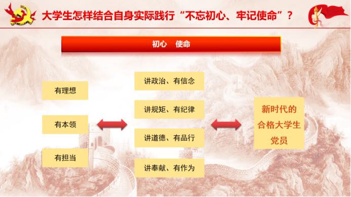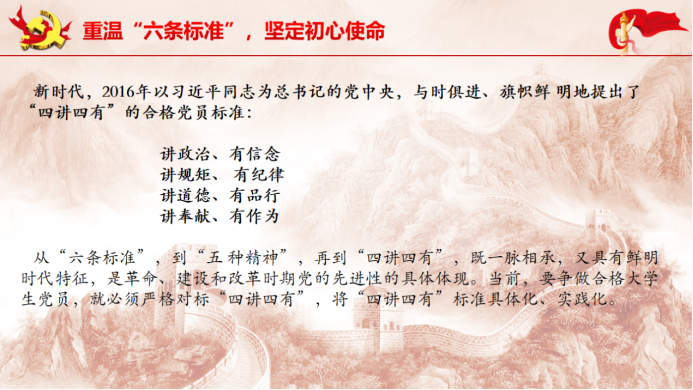 之后,吕丽书记带领全体学员重温“六条标准”,并结合改革开放之初邓小平同志的“五种精神”与新时代背景下党中央倡导的”“四讲四有”合格党员标准,提出对各位学员的期望:不忘为中国人民谋幸福的初心,牢记为中华民族谋复兴的使命。