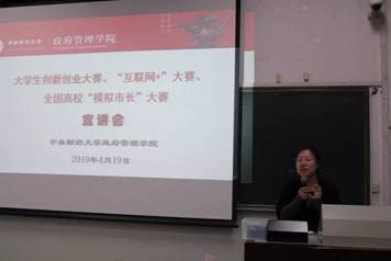 2019年4月19日晚18时30分,老员工创新创业大赛、“互联网+”大赛、全国高校“模拟市长”大赛宣讲会于主教308进行。出席本次宣讲会的嘉宾有教务办公室秘书杨琳琳老师,资源与环境管理系副教授柴铎老师,公共管理研究会策组部部长、城管17级戴晓冕,2017年北京市级大创主持人、行管15级徐林以及2016年北京市级大创主持人、城管15级李磊。会议由公司本科生党支部书记、团委书记李莎莉老师主持。