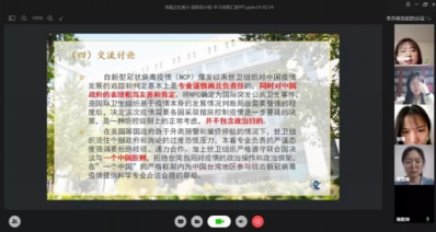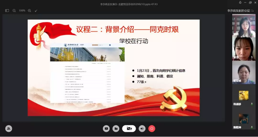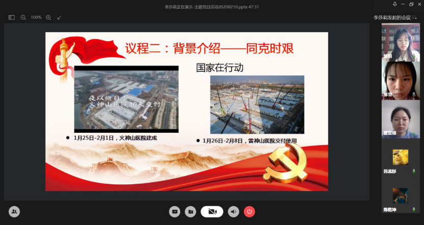 活动伊始,同学们透过自己的电脑或手机,共同起立,唱响国歌。支部书记李莎莉向支部内2位湖北籍党员及全院17位湖北籍同学问好。现居湖北宜昌的邹玥表示日常生活很平顺,一切都好,请大家放心;湖北汉川的邹雪表示,虽然疫情每天通报的数字都在变化,但是,我们有信心一切向好。
