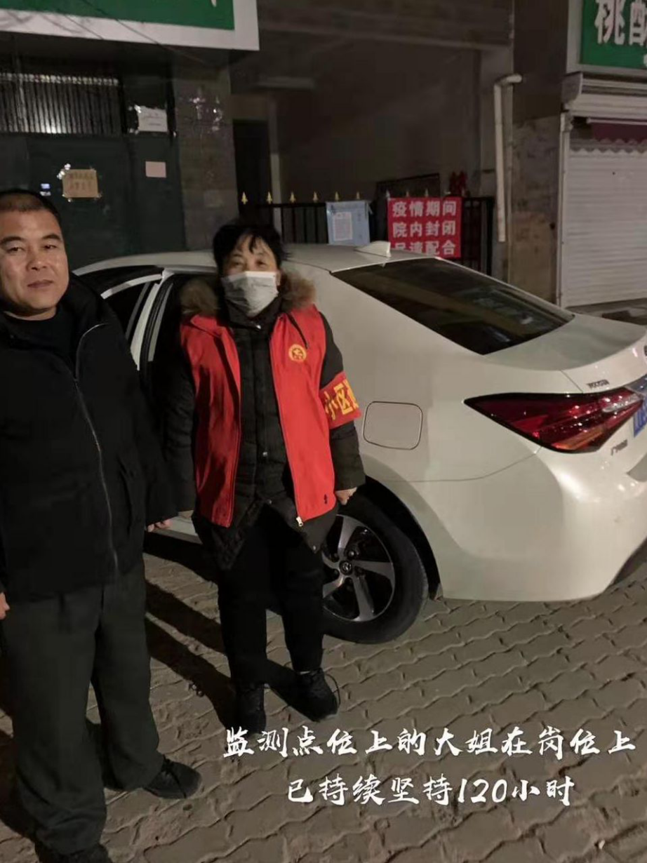 衡水有很多的老旧小区,没有物业,在处于统筹规划,合理配置的考虑下,她尽量安排本小区内群众坐班排查,24小时值班,并尽最大能力给予这些无名群众们物质支持。在此期间,由于加班熬夜,劳累过度,有许多工作人员生病了,但他们始终坚守岗位,我被触动了,自发给她当司机、当义工,这是我唯一能为她做的,我开始每天开车拉着她去检查这些监测点,中午晚上给我姐姐带来妈妈为她做的饭,不再让她吃泡面。另外在她分管的小区中有14个无物业的老旧小区,不过这些小区都设置了监测点,印象最深的是有一次是23点我开车去社区监测点,看着这些工作人员穿着大衣戴着口罩连个热水杯都没有的坐在大门口,心中的滋味是无法表达的,所以我留下来陪他们到凌晨4点才回家。