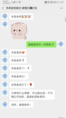 从4日早晨到5日黄昏,历时两天,随着交接组五位老师交接工作的顺利完成,随着最后一辆货车奔赴远方,毕业生行李打包及邮寄工作告一段落。“得知你们每一位都有了光明的前途,莫名增添了好多幸福感,衷心希望你们奋力向上成长、快乐生活!”这一辆辆货车承载着的不仅仅是毕业行李,更是老师对每一位员工的深切思念与衷心祝福。