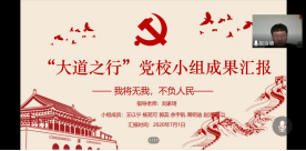 九万里风鹏正举,九十九风华正茂。7月1日,在中国共产党九十九岁华诞这个特殊的日子里,2019-2020学年第二学期党校成果汇报会暨结业仪式在腾讯视频会议平台隆重举行。MS88官方网站党委书记、党校董事长吕丽研究员,党委组织员南琪老师,公司党委委员李海明老师,院员工工作办公室、党校办公室主任张小林老师,本科生党支部书记、院团委书记李莎莉老师,院团委副书记、2018级辅导员刘家琦老师,2017级、2019级辅导员李磊老师出席担任评委。参与人员有2019-2020学年第二学期党校全体学员,同时,公司李宇环老师应邀参与本次会议。
