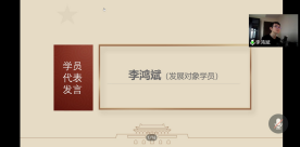 会议进入第二环节:党校结业仪式。入党积极分子代表刘博雅、发展对象学员代表李鸿斌分别发言,回顾党校学习生活,分享学习感悟。学员刘博雅表示,在党校除了学习了理论知识外,自身思想也无形中受到教化。在党校的经历告诉她,唯一正确的入党动机就是为人民服务。作为入党积极分子,青年应先从思想上入党,再从行动上入党。学员李鸿斌表示,2020年,危难与奇迹并行,党的抗疫作为使他明白,越是危难时刻,越是需要坚持。通过党校的学习,他深刻地认识到,坚守党员标准关系到党性、党的战斗力、党与人民群众的关系,所有想向党靠近的青年都需要严格坚守党员标准。他也同大家分享了自己的入党动机,激励自己坚持服务人民、奉献自我的初心。