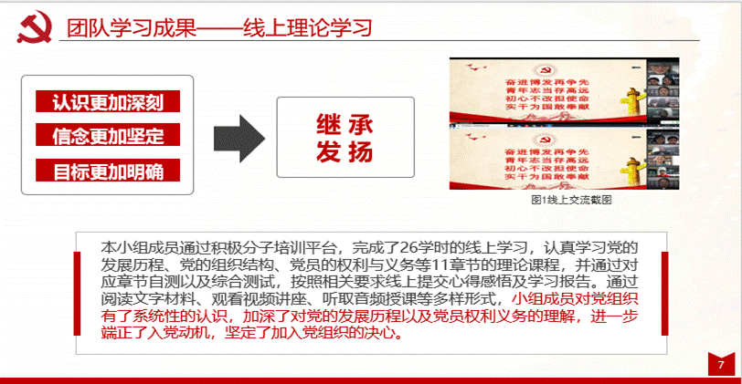 “榜样政引领”小组通过实践学习,影片记录观看等形式,结合党校学“四史”要求,深入研究了新中国土地改革历史。小组成员从理论层面分析了中国土地改革须遵循的三条原则,并结合现实生活,深刻认识到作为老员工,作为入党积极分子,应该积极承担社会责任,发扬青年人的朝气与勇气,不忘初心,努力奋斗。