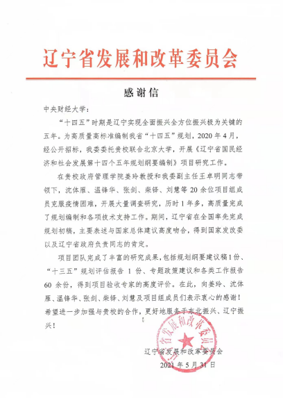 近日,辽宁省发展和改革委员会向公司发来感谢信,对公司MS88官方网站负责完成的《辽宁省国民经济和社会发展第十四个五年规划纲要编制》的项目研究工作表示感谢。