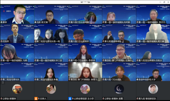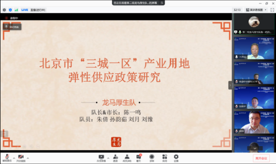 “一轴京城画队”由北京市“十四五”规划引入,通过追溯背景中轴线的文化内涵以及调查分析中轴线沿线街道现状的优势与问题所在,提出如何避免中轴线上街道陷入旅游商业化的恶循环的具体措施以及推动中轴线申遗进程的建议;并在评委老师的引导下将中轴线文化概括为庄重、严谨有序、中庸。“龙马厚生队”以全国和北京的政策导向为背景,从供应方式创新角度详细分析了“作价出资”出现的必要性,并采用问卷调查和深度访谈相结合的方式调研实践,提出对北京市“三城一区”产业用地弹性供应和政策的创新优化;并回答了评委老师关于理论来源的问题。“梦之队”从“边角剩余”空间出现的背景与意义出发,分析典型案例,深入研究相关理论,同时实地调研,采访专家,提出了健康中国战略下北京城市“边角剩余”空间的体育化,还指出了未来发展的方向和可能会遇到的问题;并回答了评委老师关于”剩余空间“改造标准的问题。“津门不锈钢队”以天津市老旧厂房改造为例,通过分析问题源流与政治政策,辨析数字孪生与城市更新的概念,提出解决构建应用平台的解决思路,分析“巧夺天工”平台运行逻辑,对平台工作机制进行剖析,明确其六大功能,完善了城市更新背景下老旧工业区转型策略;并回答了评委老师关于老旧工业区改造转型路径和商业价值如何体现的问题。“京生盎然队” 切实关注北京市人口政策,为北京市和中国的发展贡献青年思考和青年力量。他们通过线上发放定向问卷,线下对母婴室使用情况进行实地调研等,对北京市三孩政策的贯彻落实方法做出了思考与研究。“C位出道队”对北京市面向碳中和的经济转型模式构建进行了研究,在国家宏观政策和北京市相关政策双线并行的情况下,通过对国内外案例梳理,构建出了北京市面向碳中和经济转型的“IDEAL”模式及政策建议。“减减单单队” 聚焦教育双减政策,关注教育沉疴积弊。他们分析教育减负困境、解读北京市政策,从现状、现象切入,研究北京市双减政策的落实方案,以实际行动助力双减落地,守护新时代员工健康成长。“龙马骋望队”取长补短,借鉴美国和日本的成功经验;校企合作,研究北京邮电大学与中国移动研究联合创新中心的具体案例,提出“一主三翼”创新概念及建议,助力打通科技成果转化的“最后一公里“,探索北京市产学研合作新模式。“智创新区队”秉持“心系民生,智创新区,让百姓生活更美好”的理念,心系基层民生,通过文献研究、案例研究等方法,基于多元治理理论和新公共服务理论,研究了基于社区治理创新的北京市老旧小区改造的问题。