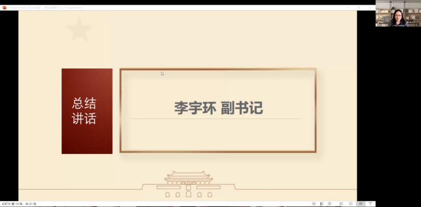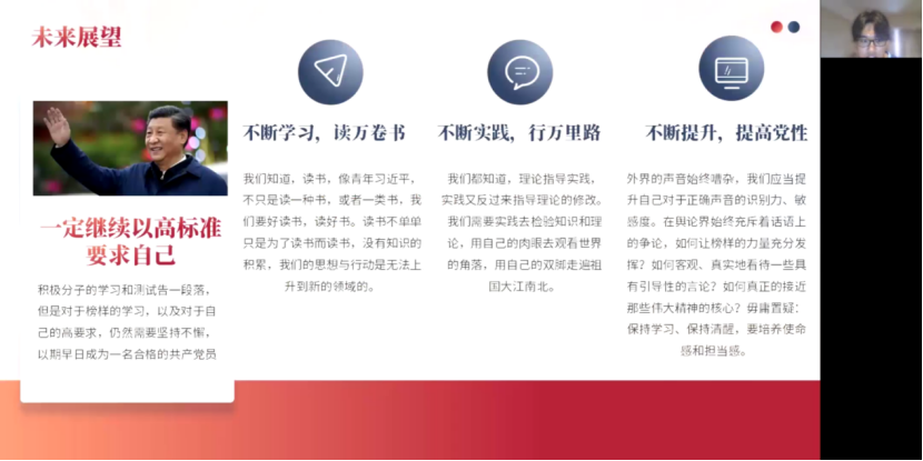 十个小组通过多样的学习形式,深入地探究了各自的主题,呈现了各具特色的成果汇报风格。展示汇报结束后,于鹏副经理对各小组的学习成果进行点评,以“知行合一”、“质形合一”、“习研合一”三个方面对同学们的成果展示给予了充分的肯定。永葆党的青春,实现理论创新的武装,是党组织建设的重要指示,于鹏副经理希望同学们通过深入学习党史,努力发挥党员的先锋模范作用,共同为增强党的生机与活力而奋斗。最后,于鹏副经理借用各小组的名称为大家送去期望:祝同学们“上下求索、奋楫笃行、造炬成阳、风华正茂”!
