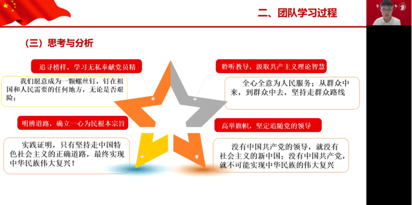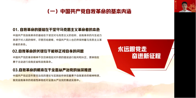 “永远跟党走,奋进新征程。”求索小组以中国共产党自我革命的逻辑经验路径和风险应对为主题,总结了中国共产党自我革命的逻辑、经验、路径和风险应对为主题,从四个方面开展了相关理论学习,并结合新形势对中国共产党自我革命应对风险挑战的优化路径与对策的思考:唯有发扬自我革命精神,发挥党的领导核心地位,才能取得民族复兴的伟大胜利。