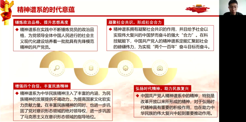 “才名留史传,谱系出先公。”“钟灵毓秀”小组围绕共产党人的精神谱系展开了理论研究,从中国共产党人的精神谱系的源头建党精神、精神谱系的三重内生特质、伦理逻辑以及其时代意蕴四个方面展开了对中国共产党人的精神谱系的深层理论研究。最后,号召我们应做共产党人精神谱系的时代传人,探寻“历史的沉淀”,拥抱历史深处的精神之火与信念之光,让精神谱系激励我们不断前进。