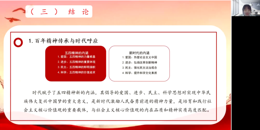 “不啻微茫,造炬成阳。”团结点点微茫,便可汇聚成太阳般的光亮。“造炬成阳小组”正是秉持着这份初心砥砺前行,在平台课程、自学的理论学习中,在感悟实践学习中,领悟党员奋斗的精神,深刻剖析了深刻改变历史的五四运动与五四精神,结合时代新变化与新要求,提出了五四精神的时代演变,最后习近平总书记给的寄语,对广大青年提出了更高的担当要求:传承五四精神,不忘党的纪律,凝聚青春力量的微茫,书写青春的华章。