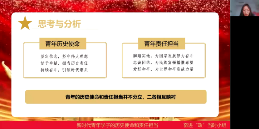 “承时代使命,谱青春华章。”奋进“政”当时小组通过理论研读与实践结合的方式,进行了以习近平总书记给青年的寄语为研究对象的学习与交流。小组注重理论联系实际,对习近平总书记自十八大以来给青年群体的回信进行文本分析,并将理论感悟落到实处。最后,小组总结得出:新时代青年学子的历史使命和责任担当二者相互映衬,吾辈学子大有可为。