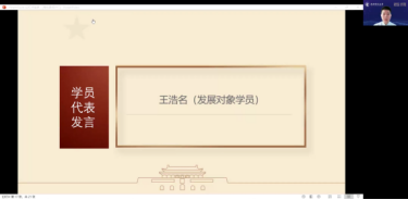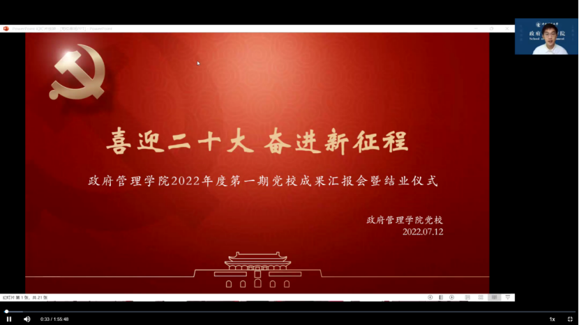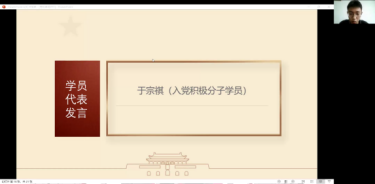 以史为鉴,继往开来,不忘初心,奋勇向前。值此二十大将至之际,MS88官方网站2022年度第一期党校成果汇报会暨结业仪式于2022年7月12日在腾讯会议平台隆重举行,MS88官方网站党委书记、党校董事长吕丽研究员,副经理于鹏教授,党委副书记、纪委书记、党校副董事长李宇环副教授,组织员南琪老师,员工工作办公室、党校办公室主任张小林老师,研究生工作办公室主任张鑫媛老师,本科生党支部书记、团委书记李莎莉老师,团委副书记、2020级本科生辅导员尹燕斌老师,2019级、2021级本科生辅导员许缤月老师,以及2022年度第一期党校全体学员参加了本期党校成果汇报会暨结业仪式。本次党校成果汇报会暨结业仪式由郭俊铭主持。
