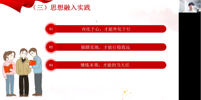 “承领袖风骨,书吾辈华章。”通过小组的学习、思考、实践和感悟,深刻领会习近平总书记对于坚守信念、牢记初心宗旨的重大论断和要求,深入体会习近平总书记和党的创新理论的真理力量。最后,回归入党积极分子、新时代青年的身份,小组总结出,青年应当把握好党的精神内核,内化于心外化于行,脚踏实地行稳致远,不断锤炼本领,担当青年的时代重任。