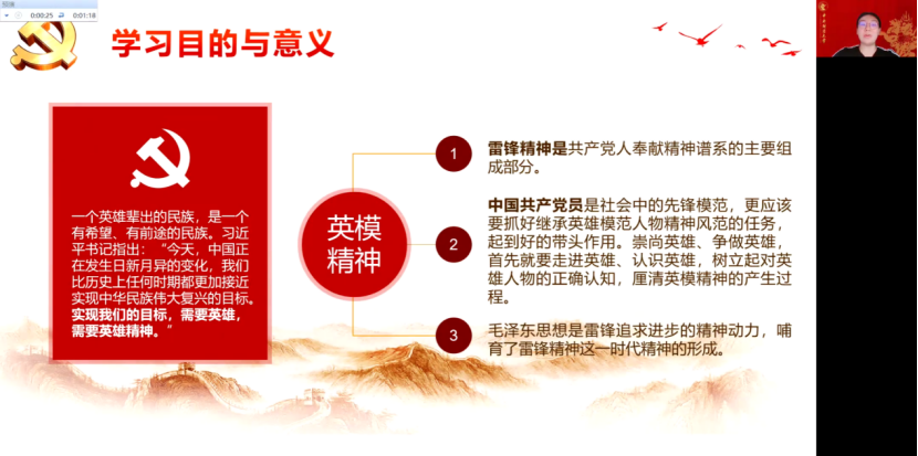 “学习先锋,争做先锋。”“正当青春”组以雷锋精神为主要学习对象,通过学习赏析、线上参观、研讨成果等方式,分享小组成员的志愿经历与思考,共同感悟共产党人全心全意为人民服务的初心和使命。同时以毛泽东思想为切入点,探寻了雷锋精神的形成过程,探究了新时代如何在实践中践行志愿精神与风范。最后,小组总结道,应以雷锋精神等英模精神为精神食粮,为中华民族伟大复兴奉献自己的光与热,进一步向党组织靠拢。