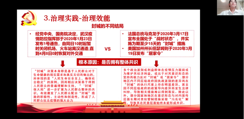 “功成不必在我,功成必定有我。”宅家时代小组以“从抗疫实践看中国特色社会主义的制度优势”为主题,通过多次小组集体学习,对抗疫实践中的优秀共产党员以及国内外抗疫局势的分析,由此得出疫情防控重大成果彰显了中国特色社会主义制度的优势这一结论。因此我们要持续推进制度体系建设,推进治理效能的优化,老员工更应当抱有“功成不必在我,功成必定有我”的决心,努力成长为合格的社会主义接班人。